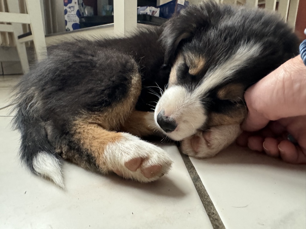 Es kommt ja immer anders, als man denkt. 5 Welpen waren da. Sie gefielen mir ausgesprochen gut. Sie waren alle aufgeschlossen und munter. Mit Begeisterung wurden meine Cousine und ich beknabbert und beklettert. Doch die beiden Blauaugen und ich fanden den Draht nicht zueinander, zuerst war ich verwirrt, denn irgendwie war ich so fest davon ausgegangen, dass einer von beiden der passende Hund für mich war. Ich kann das Gefühl gar nicht so beschreiben. Aber bei einem dachte ich, dass er der perfekte Hund für mich war. Also wurden die anderen Welpen noch einmal genauer unter die Lupe genommen und da war sie! Das kleine Mädchen mit der symmetrischen Zeichnung. Das kleine Mädchen mit den braunen Augen und der wunderschönen feinen weißen Blässe. Eigentlich nur ein ganz feiner Strich. Sie war mein Mädchen. Ich spürte es als sie in meinem Arm lag und mich anlachte.