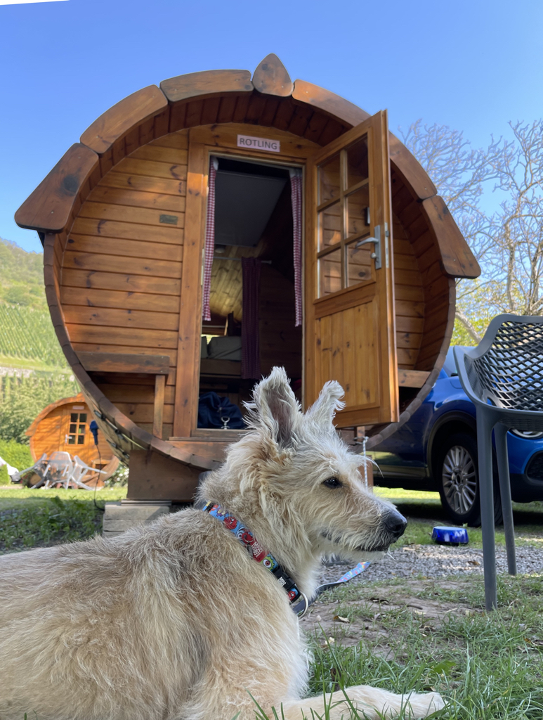 Im frühen Herbst gönnte ich mir einen Kurztrip an die Mosel. Shiva und ich übernachteten in einem Schlaffass. Es war toll, aber meine Güte, war das heiß. Die letzten Tage hatte die Sonne so richtig Fahrt aufgenommen und das Fass heizte sich auf. Shiva und ich waren beide etwas am Japsen. Aber wir genossen unseren Urlaub und lernten auch Penny mit ihrem Frauchen Claudi kennen. Es war einfach toll! Wir verstanden uns super und auch Penny und Shiva fanden sich okay, da sie beide eher kein Interesse an einer näheren Bekanntschaft hatten und ihr Ding machten.